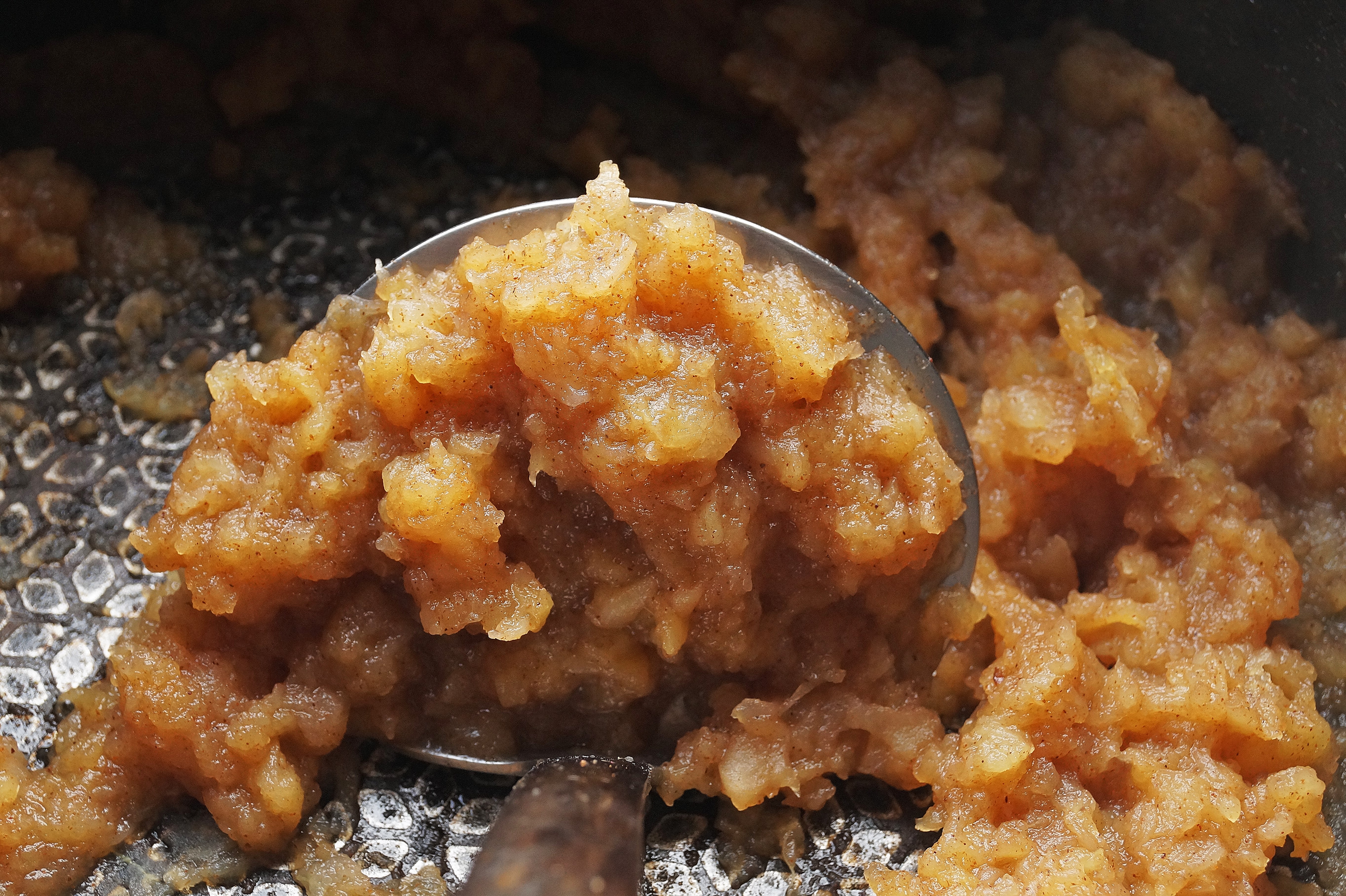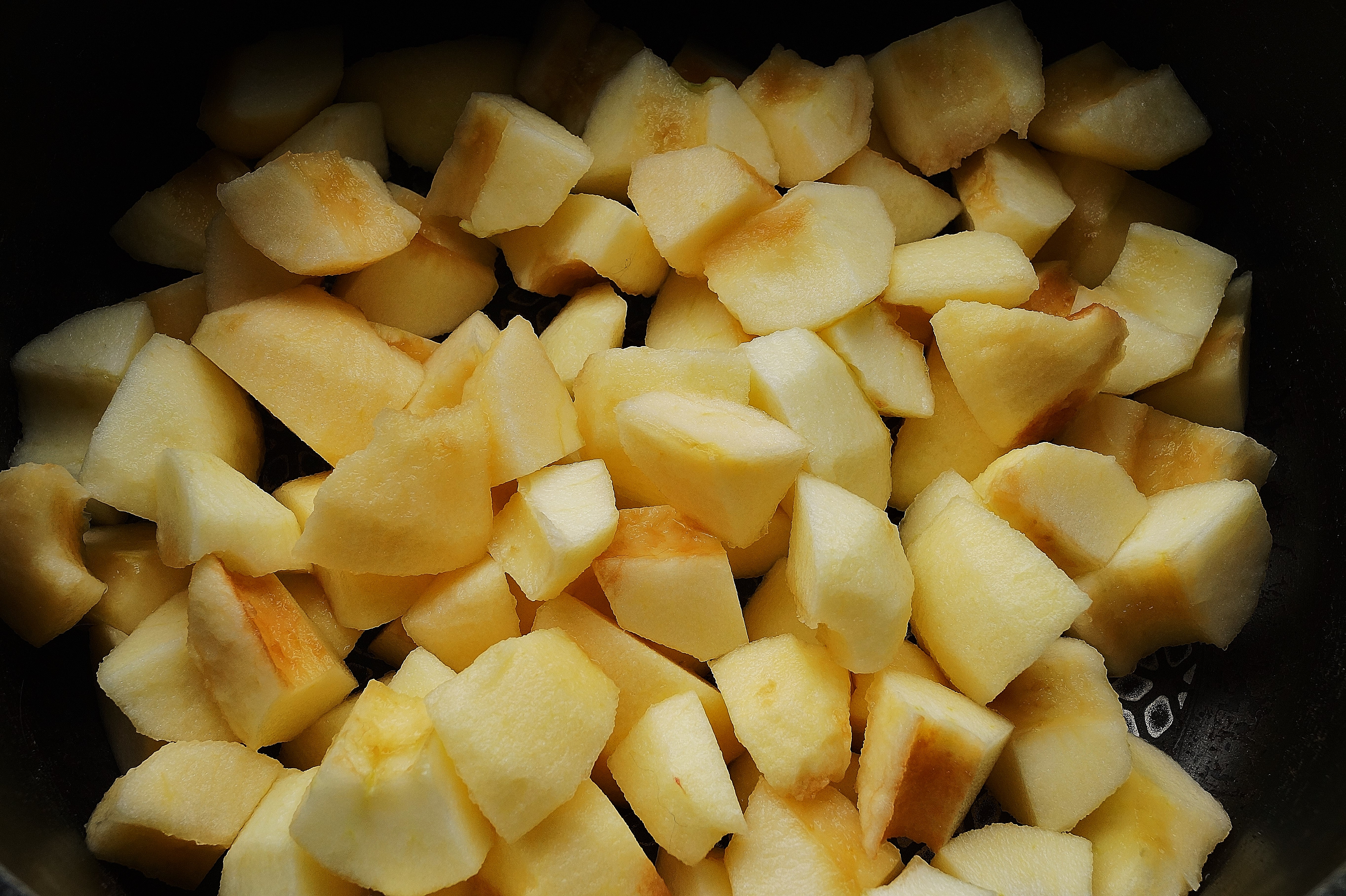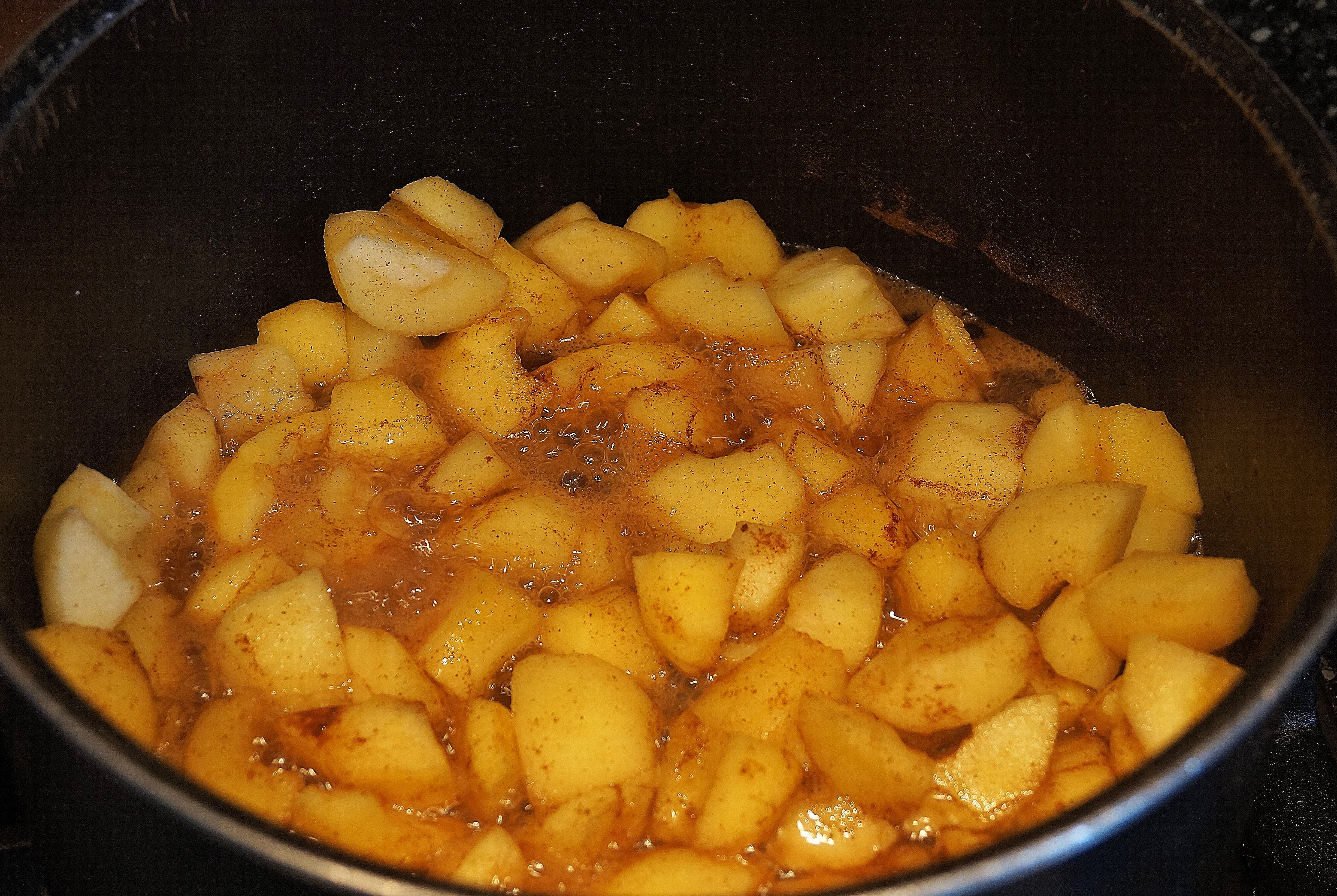 Simmer the chopped apples until soft, with 100g of sugar if they are a bit acidic, less if they are sweet. I also add a pinch of ground cinnamon…