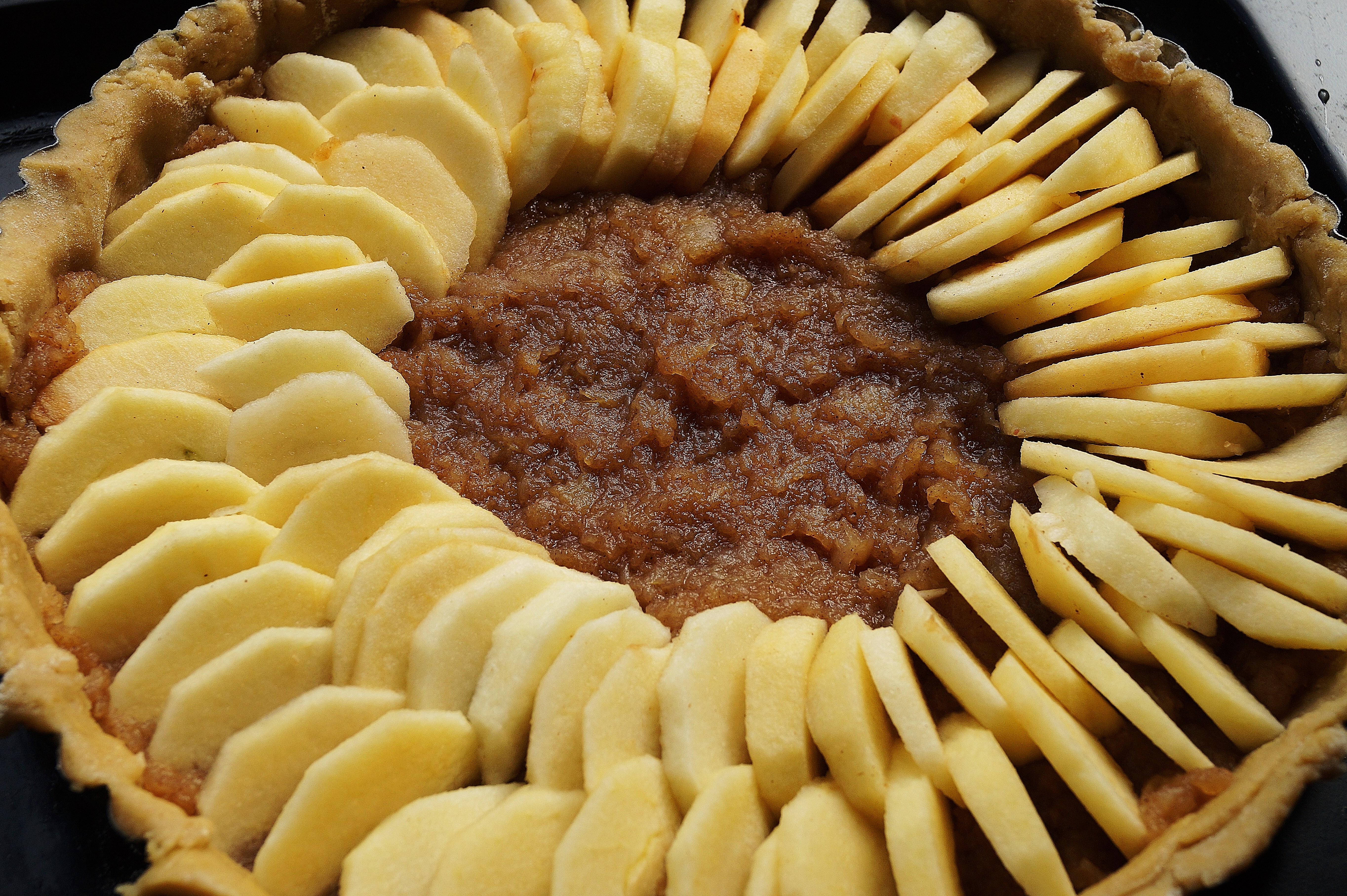 Ok, the dough should be rested, roll it onto a buttered and floured tart dish and scoop the compote at the bottom; once done, core and peel another 5 or 6 apples, cut them all in halves and then thinly chopped as crescents. You can now start to lay them from the outside to the centre, overlapping them as you get to the second round…